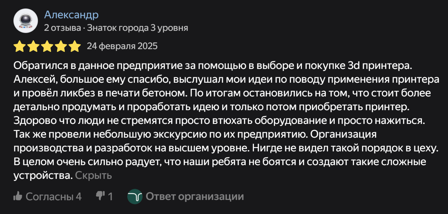 Обратился в данное предприятие за помощью в выборе и покупке 3d принтера. Алексей, большое ему спасибо, выслушал мои идеи по поводу применения принтера и провёл ликбез в печати бетоном. По итогам остановились на том, что стоит более детально продумать и проработать идею и только потом приобретать принтер. Здорово что люди не стремятся просто втюхать оборудование и просто нажиться. Так же провели небольшую экскурсию по их предприятию. Организация производства и разработок на высшем уровне. Нигде не видел такой порядок в цеху. В целом очень сильно радует, что наши ребята не боятся и создают такие сложные устройства